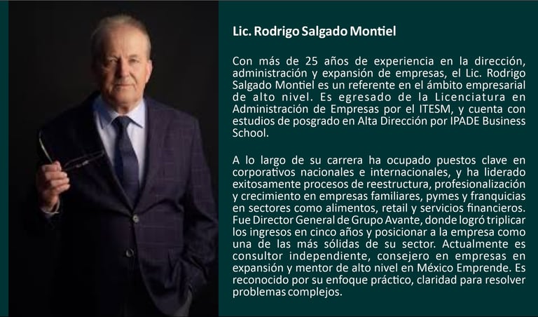 Nuestra red está conformada exclusivamente por empresarios y líderes con una trayectoria comprobada de éxito, reconocimiento y prestigio en su sector. Son profesionales que han construido, liderado y transformado negocios reales, y que ahora comparten su experiencia para guiar a otros con ética, generosidad y visión estratégica. Ser parte de esta red es un honor que se gana con resultados, no con títulos; por eso, cada mentor de México Emprende es una figura de referencia, no solo por lo que sabe, sino por lo que ha logrado.